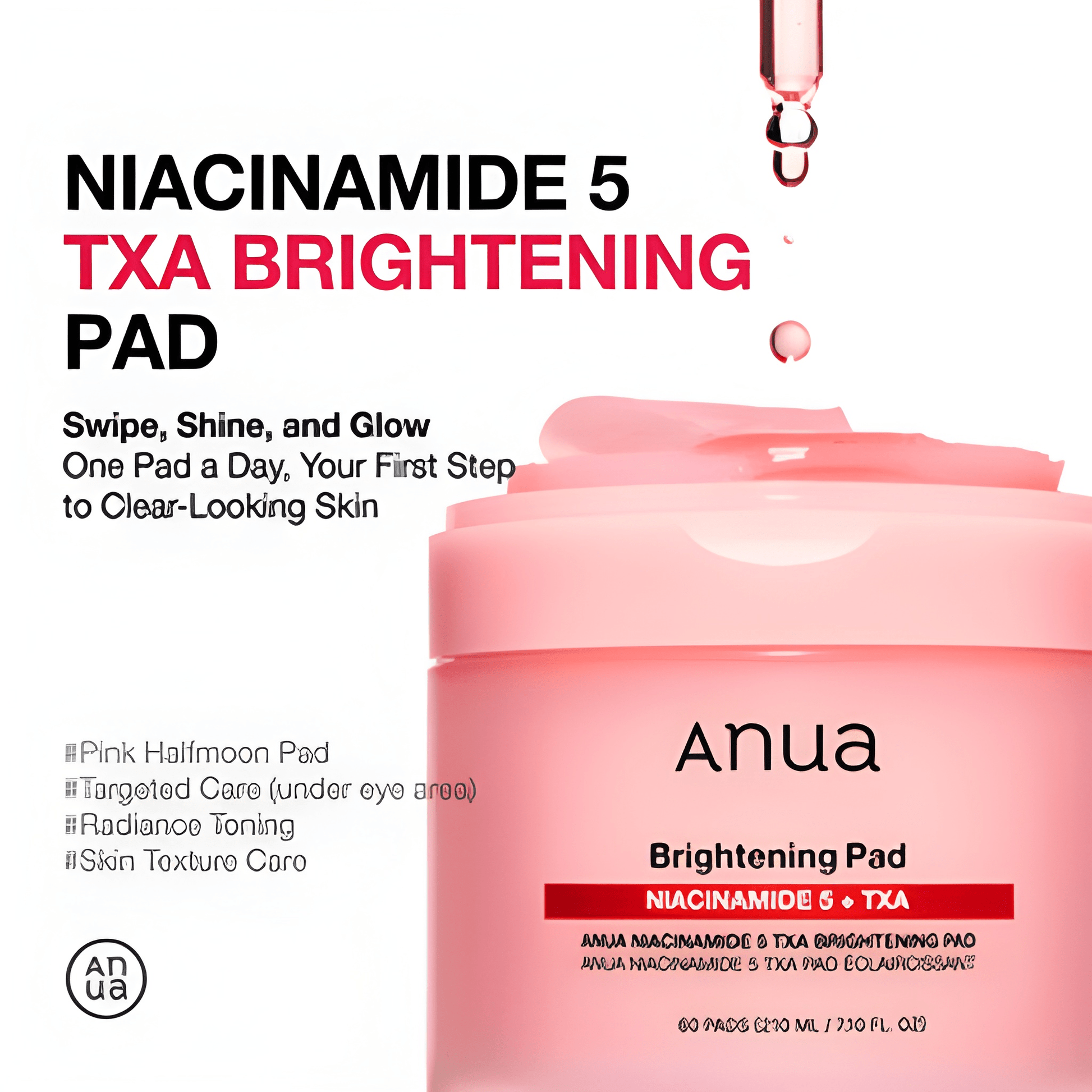 Anua Brightening Pad is a daily tone-up skincare solution designed to brighten dull skin, reduce dark spots, and improve overall skin clarity. Infused with Niacinamide 5% and Tranexamic Acid (TXA), these pre-soaked pads help even out skin tone while gently hydrating and refreshing the skin.